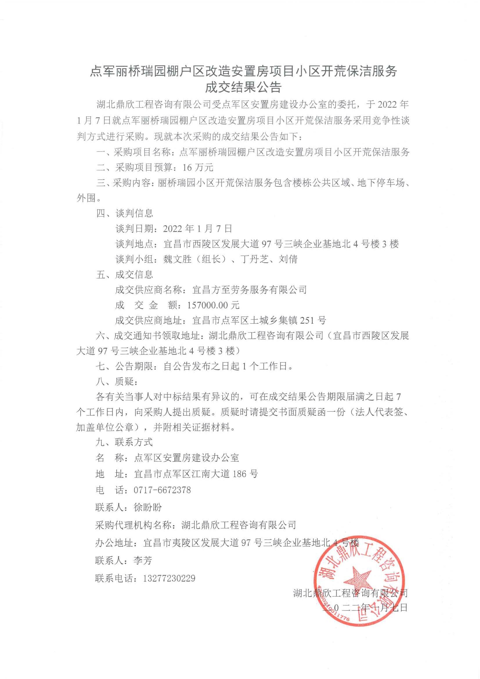點(diǎn)軍麗橋瑞園棚戶區(qū)改造安置房項(xiàng)目小區(qū)開荒保潔服務(wù)成交公告