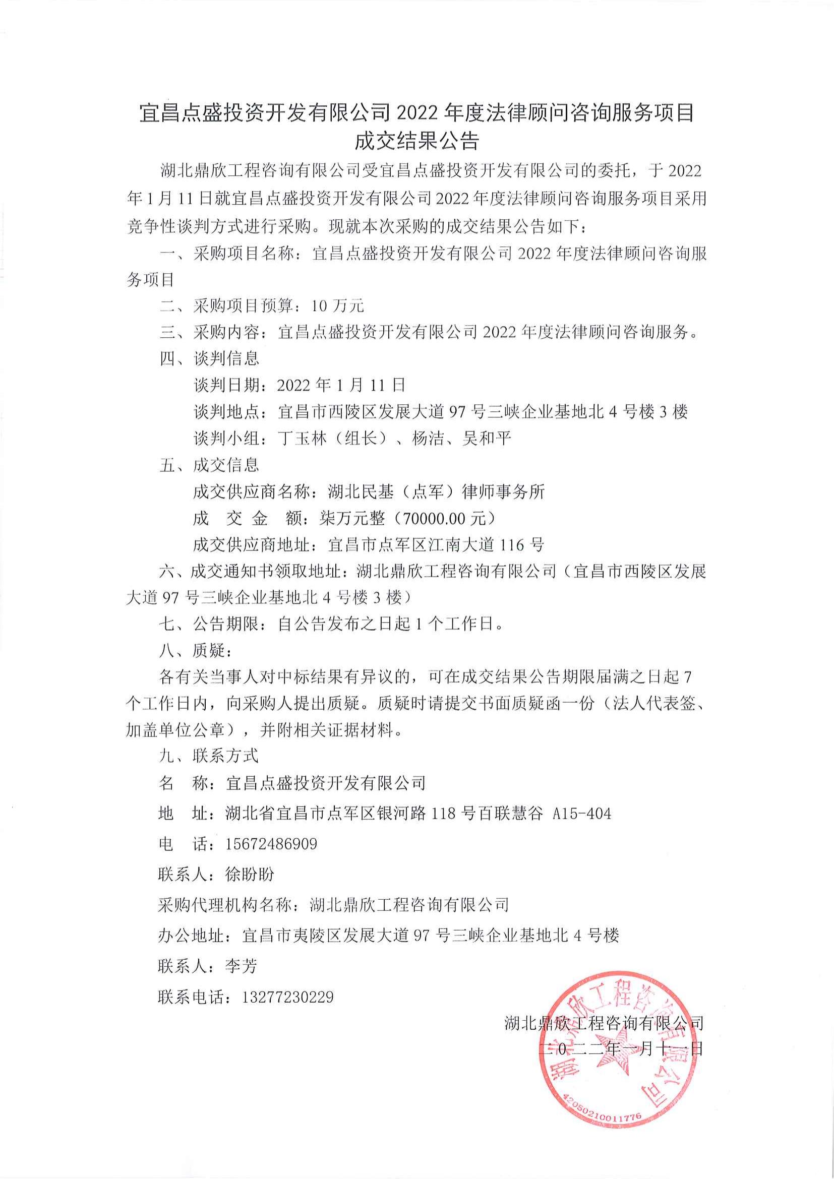 宜昌點盛投資開發(fā)有限公司2022年度法律顧問咨詢服務項目成交公告