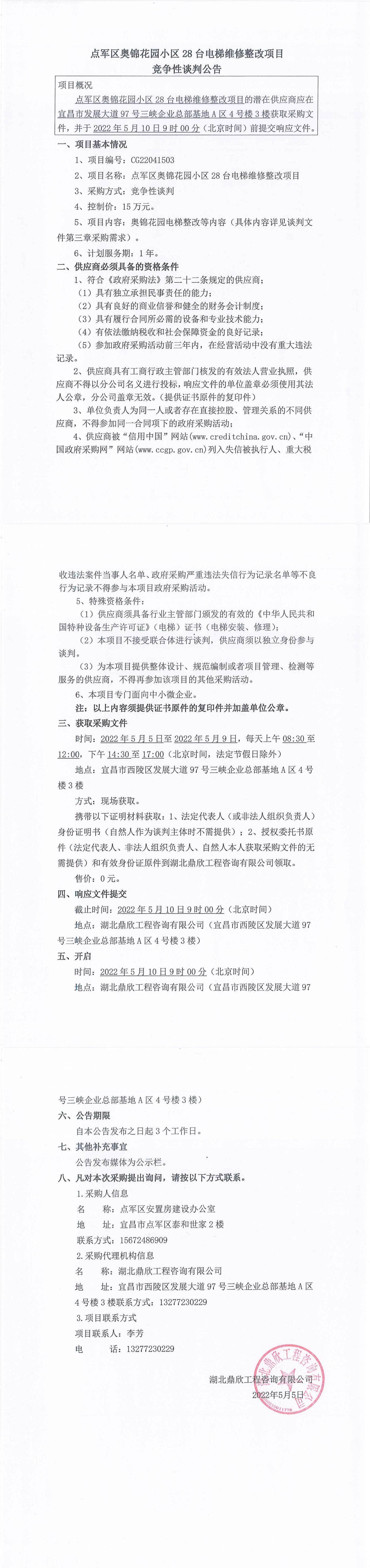 點軍區(qū)奧錦花園小區(qū)28臺電梯維修整改項目談判公告