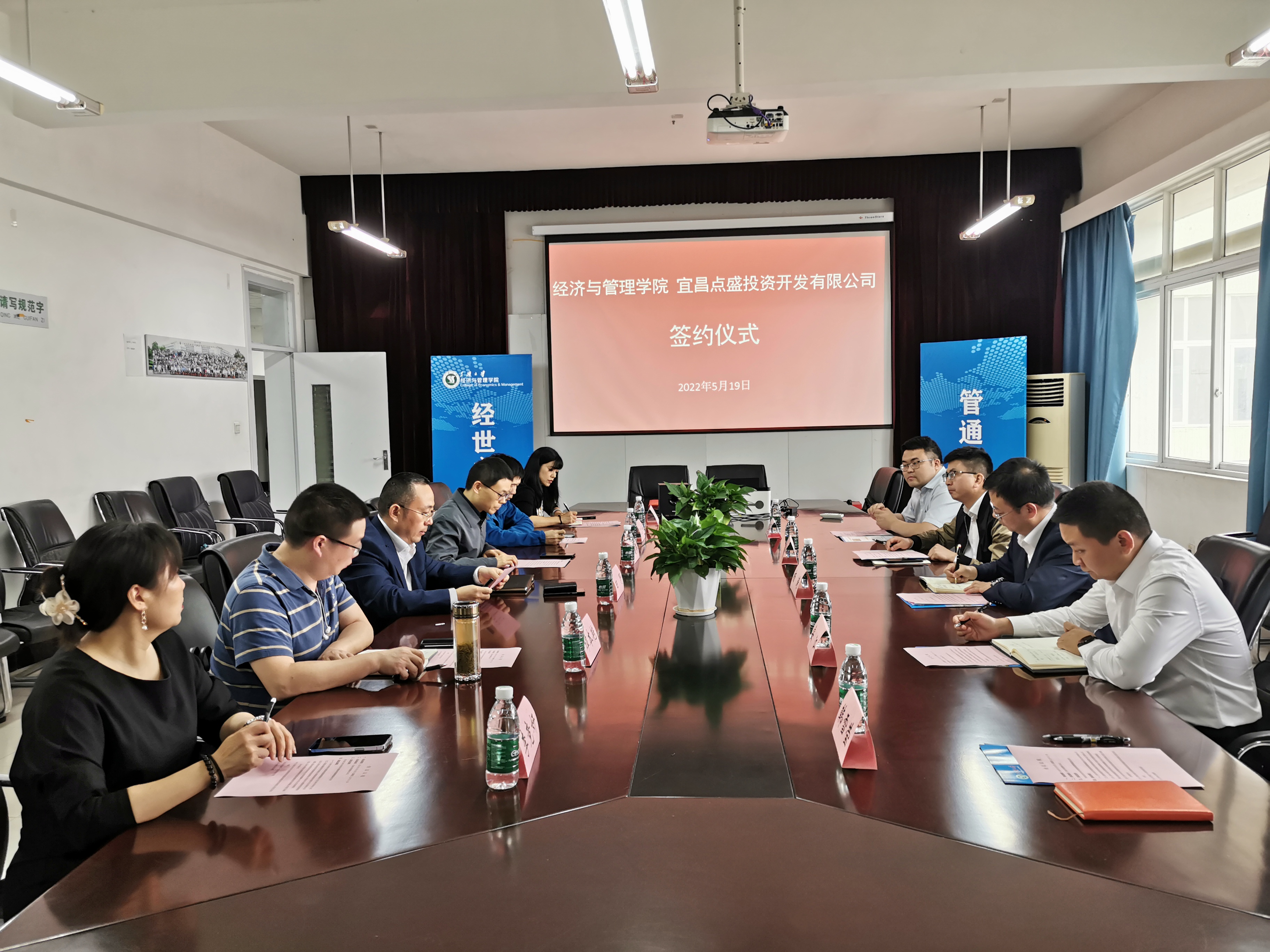 楊濤、覃朝暉代表雙方簽訂了《宜昌點盛投資開發(fā)有限公司與三峽大學(xué)經(jīng)濟與管理學(xué)院戰(zhàn)略合作意向書》。