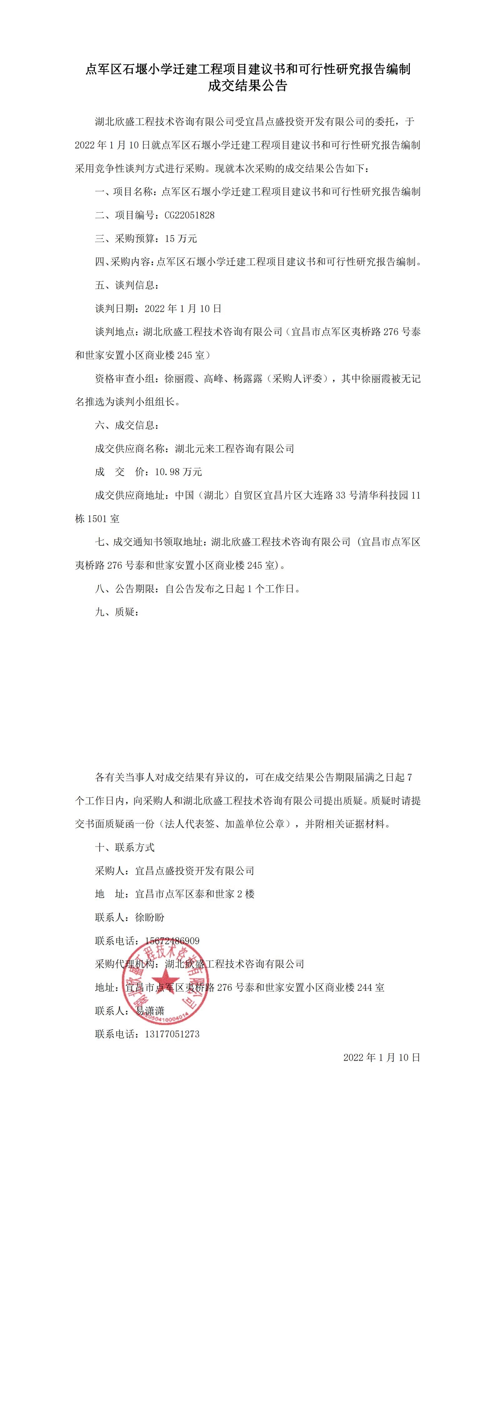 點(diǎn)軍區(qū)石堰小學(xué)遷建工程項(xiàng)目建議書和可行性研究報(bào)告編制成交結(jié)果公告
