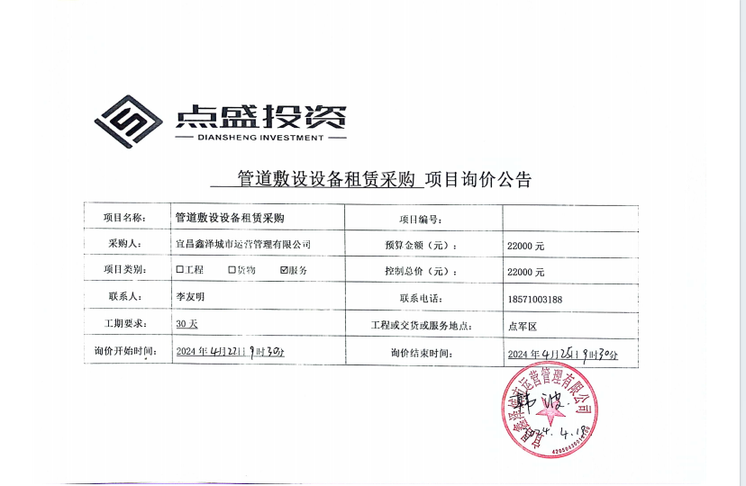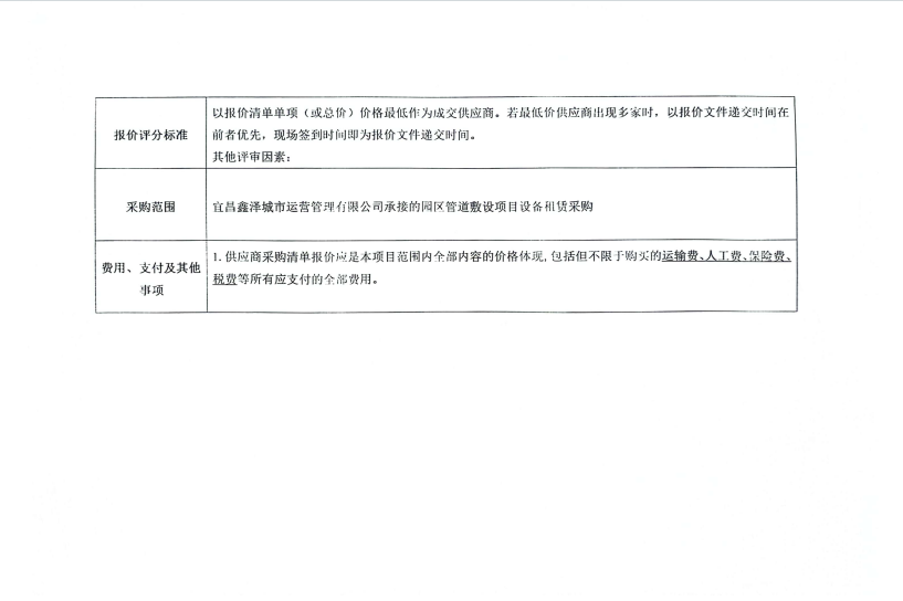 宜昌鑫澤城市運營管理有限公司管道敷設(shè)設(shè)備租賃采購項目詢價公告