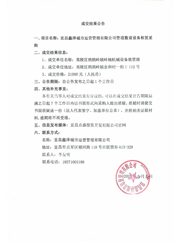 宜昌鑫澤城市運(yùn)營管理有限公司管道敷設(shè)設(shè)備租賃采購項(xiàng)目