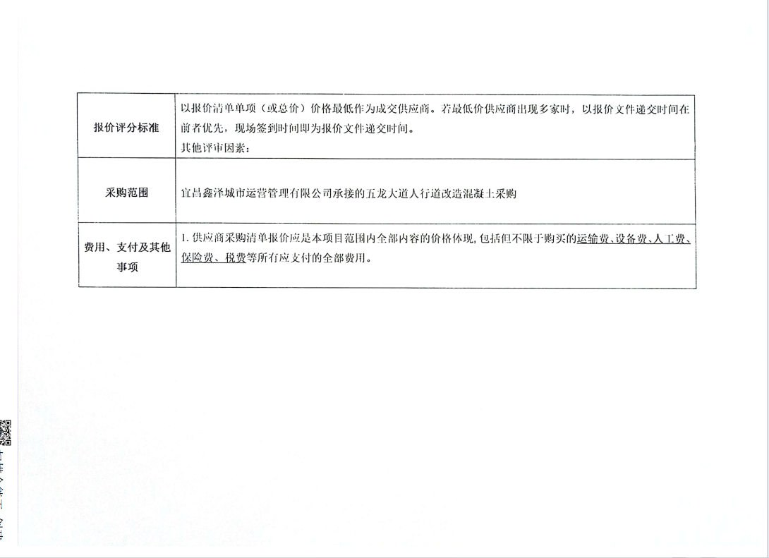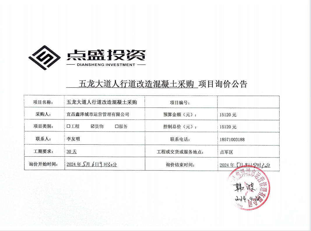 五龍大道人行道改造混凝土采購項目詢價公告
