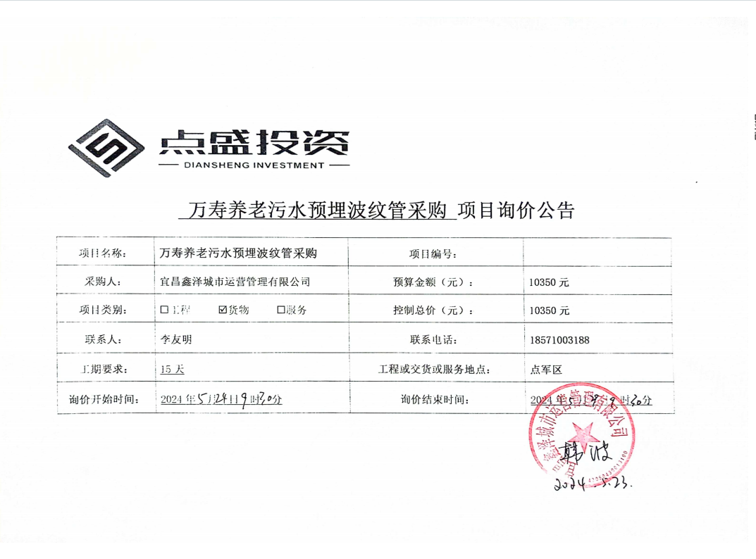 萬壽養(yǎng)老污水預(yù)埋波紋管采購詢價公告