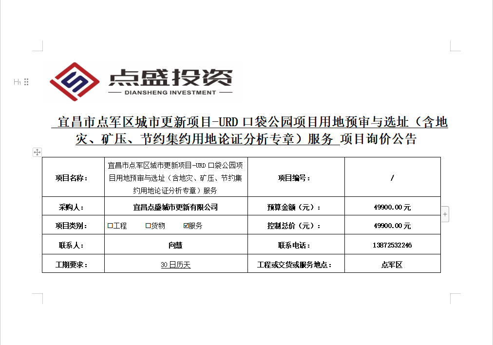 宜昌市點(diǎn)軍區(qū)城市更新項(xiàng)目-URD口袋公園項(xiàng)目用地預(yù)審與選址(含地災(zāi)、礦壓、節(jié)約集約用地論證分析專章)服務(wù)詢價(jià)公告