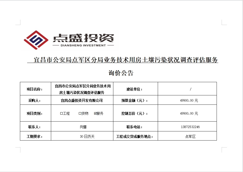 宜昌市公安局點(diǎn)軍區(qū)分局業(yè)務(wù)技術(shù)用房土壤污染狀況調(diào)查評估服務(wù)詢價公告