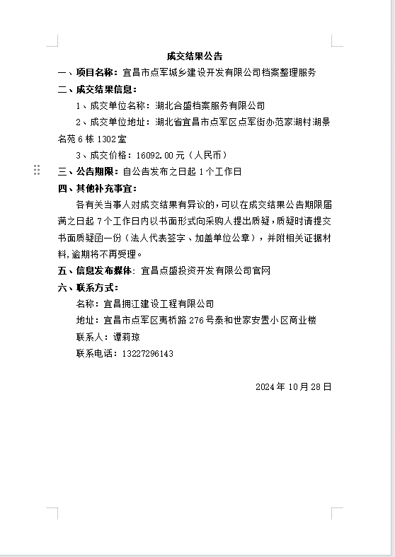 宜昌市點軍城鄉(xiāng)建設(shè)開發(fā)有限公司檔案整理服務(wù)成交公告