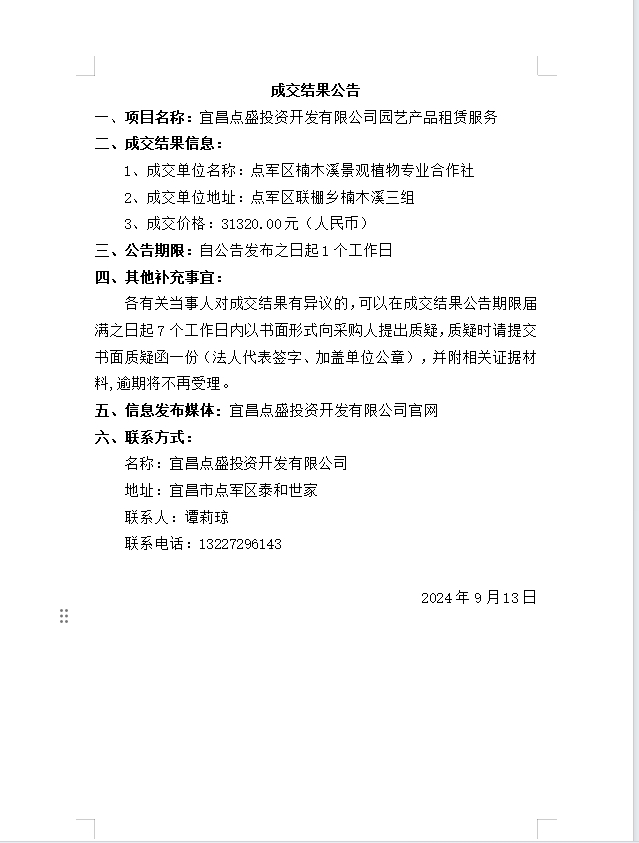 宜昌點(diǎn)盛投資開(kāi)發(fā)有限公司園藝產(chǎn)品租賃服務(wù)成交公告