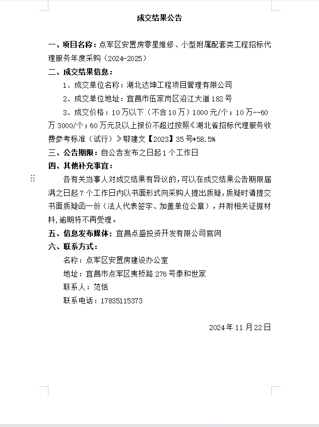 點軍區(qū)安置房零星維修、小型附屬配套類工程招標代理服務年度采購(2024-2025)成交公告