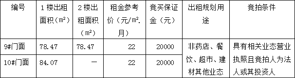 上述第9號(hào)門(mén)面房整體出租1至2樓,10#門(mén)面房只出租一樓。目前,上述門(mén)面房均處于空置的毛坯狀態(tài),現(xiàn)狀分別對(duì)外出租。相關(guān)競(jìng)買(mǎi)事項(xiàng)詳見(jiàn)本公司拍賣(mài)資料中的《競(jìng)買(mǎi)協(xié)議》樣本特別說(shuō)明條款內(nèi)容,且標(biāo)的物自公告之日起至2021年12月10日17:00止,在標(biāo)的物現(xiàn)場(chǎng)展示(集中看房時(shí)間定于2021年12月10日8:30-12:00,14:00-17:00)。